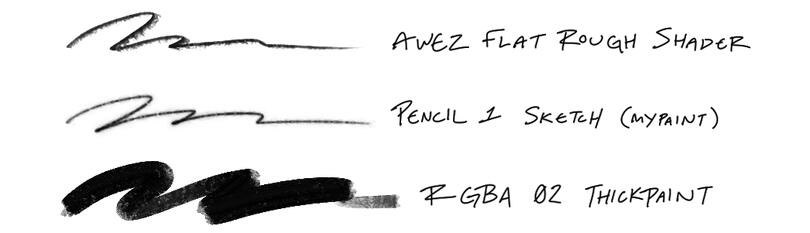 i primarily use krita for my artwork — i usually do lineart with awez flat rough shader from this brush pack or pencil 1 sketch (mypaint), and color with rgba 02 thickpaint, the latter two being built-in to the program! you're welcome to ask if you're curious about one that doesn't match these! ♡